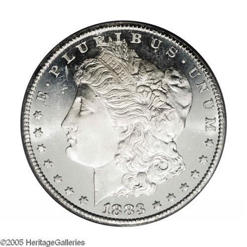 <B>1883-CC<S$1> MS66 Deep Mirror Prooflike PCGS.</B></I> Nearly untoned with impeccably smooth, glassy fields that contrast nicely with the stark-white design elements. Sharply struck on the motifs, though the hair over Liberty's ear is a tad soft. A reeding mark between PL in PLURIBUS is shallow and not particularly detrimental, but is mentioned for pedigree purposes. Population: 94 in 66 Deep Mirror Prooflike, 2 finer (10/05).
