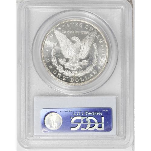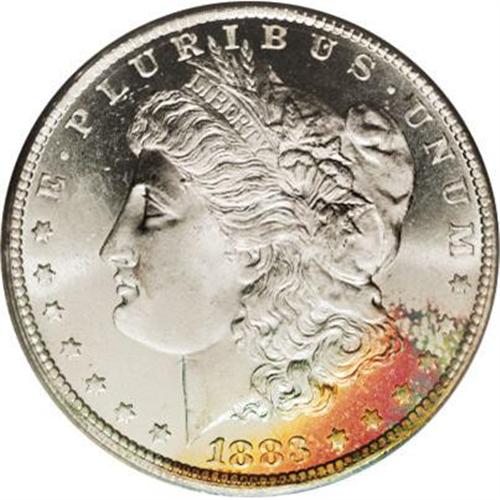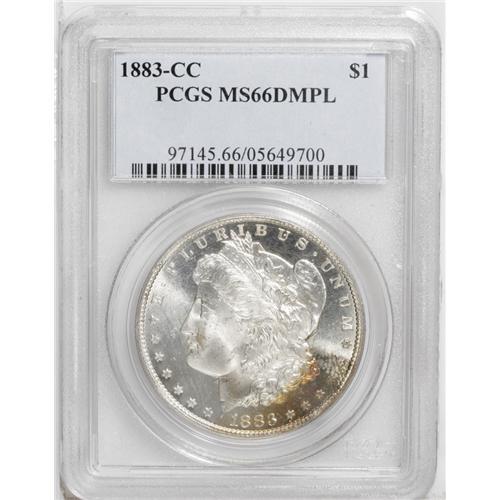 <B>1883-CC<img border='0' src='http://www.heritagecoins.com/images/star.gif' width=10 height=10>$1> MS66 Deep Mirror Prooflike PCGS.</B></I> Unusual but lovely toning through the date and below the neck, in hues from amber and gold through crimson and maroon. The balance of the coin is brilliant, with coruscating luster over the deeply mirrored fields that contrast sharply with the frosty devices. Population: 97 in 66 Deep Mirror Prooflike, 2 finer (7/06).