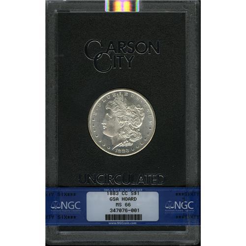 <B>1883-CC<img border='0' src='http://www.heritagecoins.com/images/star.gif' width=10 height=10>$1> MS66 NGC.</B></I> A brilliant, lustrous, and mildly prooflike Premium Gem. Crisply struck, and unusually clean for a GSA dollar. Countless high quality GSA dollars were removed from their holders for third-party certification prior to 2003.