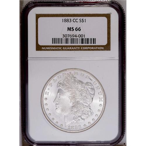 <B>1883-CC<img border='0' src='http://www.heritagecoins.com/images/star.gif' width=10 height=10>$1> MS66 NGC.</B></I> A layer of thick mint frost covers each side of this dazzling ice-white Premium Gem. Well struck with a few trivial surface blemishes and several faint roller marks (as struck) on Liberty's jaw. Scarce so fine. <BR><BR><B>Important notice:</B> Heritage usually auctions material at the rate of 200-250 lots per hour. On some occasions eBay Live bid software or the Internet may not be able to keep up with the pace of the auction. We recommend placing a realistic absentee bid now as insurance to avoid disappointment. Occasionally the auctioneer may eliminate or reject an eBay Live bid, and the auctioneer may also reopen a lot after the close of the eBay live bidding (usually because we missed an audience bid), and may reject your bid even if it shows you as the winning bidder. By bidding via eBay Live, you agree that Heritage may award the lot to another bidder at its sole discretion under the circumstances described above or any other reasonable circumstances. Since eBay bids are not shown to us until we open the lot on the floor, we treat those bids just like floor bids. In most cases the floor responds before the eBay bid is presented to us, due to Internet lag time, so for consistency we have made it a policy that floor bids are always considered first over tie eBay live bids. Also please note that all Heritage lots purchased through eBay Live carry a 20% Buyer's Premium. Please make sure you read the Terms and Conditions before you bid. This lot is being auctioned in conjunction with a live floor auction by Heritage Galleries & Auctioneers. All final auction and invoice information will be supplied by Heritage Galleries & Auctioneers, and all other information should be considered preliminary. Lot:3365 <BR><BR><B>Winning Notification and Billing:</B> After the FINAL session in this auction is complete, Heritage will send e-mail and snail mail invoices. This process normally takes several days. All final auction and invoice information will be supplied by Heritage Galleries & Auctioneers, and all other information should be considered preliminary. <BR><BR>This auction will be conducted on a live auction floor and over the Internet through eBay Live. If you choose to place an absentee bid, please take a moment to <font color='#0000ff'><u><a href='http://pages.ebay.com/liveauctions/help/before/laabsentee.html'>learn how eBay Live absentee bidding works</a></u></font><font color='#000000'>