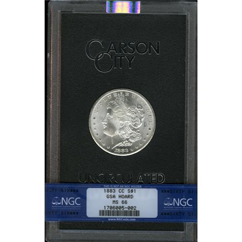 <B>1883-CC S$1 MS66 NGC.</B></I> A radiant, untoned Premium Gem piece, with a sharp strike and cascading cartwheel luster. The piece is perhaps only a couple of tiny luster scrapes away from an even finer grade. Original black GSA box of issue and COA included.<BR><BR><b>Shipping:</b> Coins & Currency (<a target="_blank" href="http://www.heritageauctions.com/common/shipping.php">view shipping information</a>)