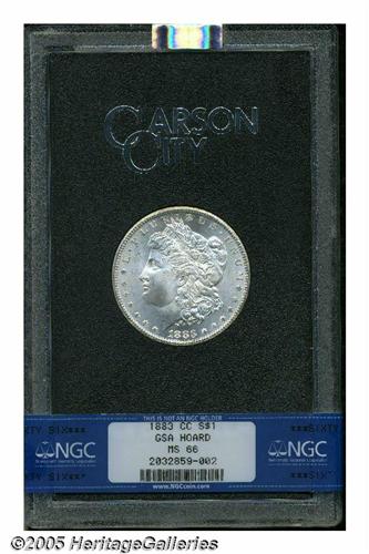 <B>1883-CC<S$1> MS66 NGC.</B></I> Light gold color graces the lower reverse of this meticulously struck and lustrous premium Gem. The obverse has only faint tan hues. A gorgeous piece, far finer in quality than most of the remaining GSA holder examples.