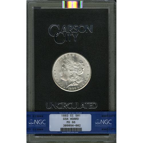 <B>1883-CC<img border='0' src='http://www.heritagecoins.com/images/star.gif' width=10 height=10>$1 MS66 NGC.</B></I> This dazzling and boldly struck high grade Carson City Dollar has just a trace of gold patina. The certificate and box accompany the lot.