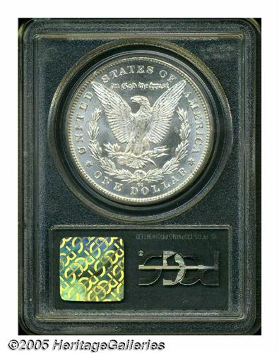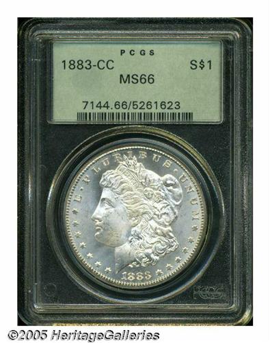 <B>1883-CC<S$1> MS66 PCGS.</B></I> A nearly untoned semi-prooflike premium Gem, suitably struck and impressively undisturbed. Certified in a green label holder.