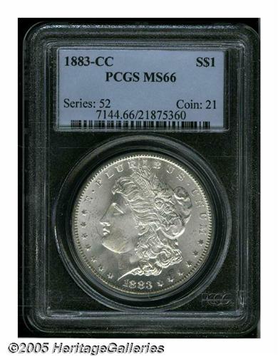 <B>1883-CC<S$1> MS66 PCGS.</B></I> Brilliant and sharply struck with bright silver color on the obverse and wisps of champagne on the reverse.