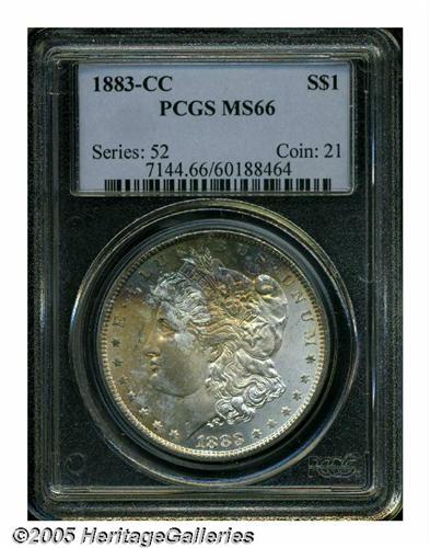 <B>1883-CC<S$1> MS66 PCGS.</B></I> Brilliant, lustrous surfaces intermix with iridescent multicolored toning, which is more extensive on the obverse, and are generally devoid of significant marks. The design elements are well struck, though there are hints of softness in the hair over Liberty's ear.