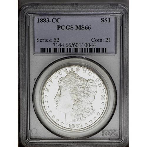 <B>1883-CC<img border='0' src='http://www.heritagecoins.com/images/star.gif' width=10 height=10>$1> MS66 PCGS.</B></I> Nicely preserved, radiantly lustrous surfaces are essentially untoned, and exhibit sharply struck design features. Light roller marks extend from the cheek across the ear and the hair above. <BR><BR><B>Important notice:</B> Heritage usually auctions material at the rate of 200-250 lots per hour. On some occasions eBay Live bid software or the Internet may not be able to keep up with the pace of the auction. We recommend placing a realistic absentee bid now as insurance to avoid disappointment. Occasionally the auctioneer may eliminate or reject an eBay Live bid, and the auctioneer may also reopen a lot after the close of the eBay live bidding (usually because we missed an audience bid), and may reject your bid even if it shows you as the winning bidder. By bidding via eBay Live, you agree that Heritage may award the lot to another bidder at its sole discretion under the circumstances described above or any other reasonable circumstances. Since eBay bids are not shown to us until we open the lot on the floor, we treat those bids just like floor bids. In most cases the floor responds before the eBay bid is presented to us, due to Internet lag time, so for consistency we have made it a policy that floor bids are always considered first over tie eBay live bids. Also please note that all Heritage lots purchased through eBay Live carry a 20% Buyer's Premium. Please make sure you read the Terms and Conditions before you bid. This lot is being auctioned in conjunction with a live floor auction by Heritage Galleries & Auctioneers. All final auction and invoice information will be supplied by Heritage Galleries & Auctioneers, and all other information should be considered preliminary. Lot:3369 <BR><BR><B>Winning Notification and Billing:</B> After the FINAL session in this auction is complete, Heritage will send e-mail and snail mail invoices. This process normally takes several days. All final auction and invoice information will be supplied by Heritage Galleries & Auctioneers, and all other information should be considered preliminary. <BR><BR>This auction will be conducted on a live auction floor and over the Internet through eBay Live. If you choose to place an absentee bid, please take a moment to <font color='#0000ff'><u><a href='http://pages.ebay.com/liveauctions/help/before/laabsentee.html'>learn how eBay Live absentee bidding works</a></u></font><font color='#000000'>