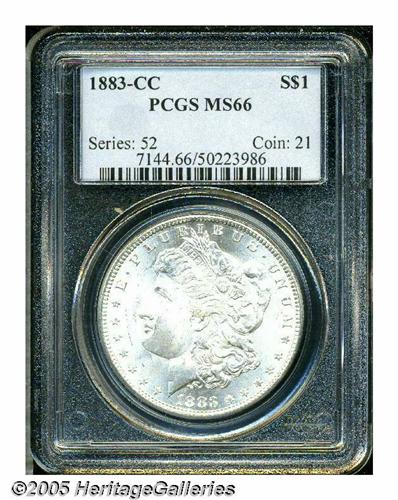 <B>1883-CC<S$1> MS66 PCGS.</B></I> This virtually white Morgan dollar exhibits radiant luster and sharply struck design features. A few minute marks on Liberty's cheek do not detract from the coin's overall appeal. PCGS has certified 95 coins finer (6/05).