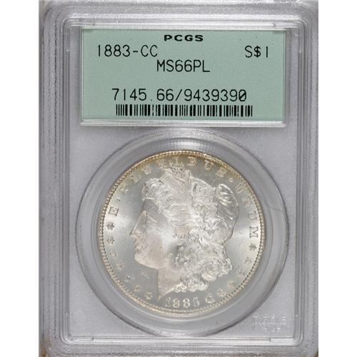 <B>1883-CC S$1 MS66 Prooflike PCGS.</B></I> Glimpses of lemon toning adorn the borders, but this well struck Premium Gem is otherwise nearly brilliant. The reverse is virtually immaculate, and the portrait has only trivial grazes. Housed in an old green label holder.<BR><BR><b>Shipping:</b> Coins & Currency (<a target="_blank" href="http://www.heritageauctions.com/common/shipping.php">view shipping information</a>)