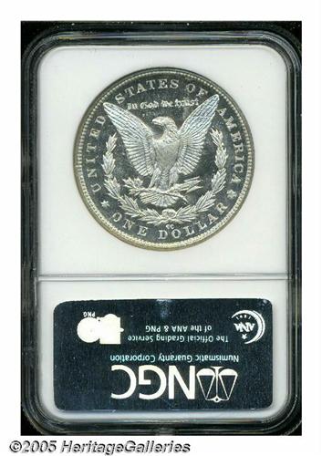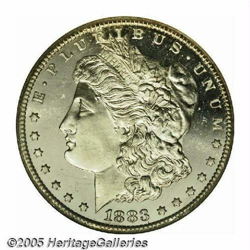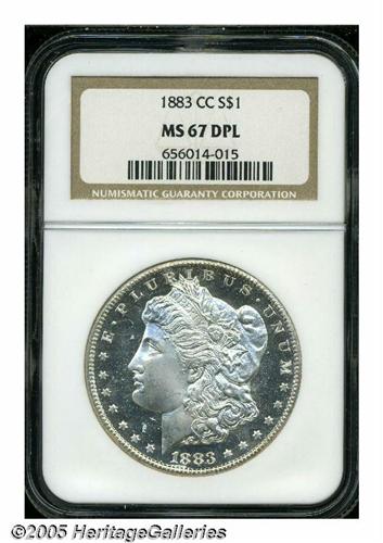 <B>1883-CC<S$1> MS67 Deep Mirror Prooflike NGC.</B></I> Just about any Morgan Dollar collector, whether a beginner or a 30-year veteran, would love to own at least one Superb DMPL example of this immensely popular type. Add to the wish list the presence of a Carson City mintmark and even those with the deepest pockets are apt to come away empty handed. The challenge with the 1883-CC, one of the most common Carson City Morgans, is not its overall availability or even its difficulty with DMPL qualities. The real quest is to locate one that has somehow managed to sufficiently escape contact with other coins to qualify at the Superb grade level. Here is one such CC Morgan. The coin is remarkably smooth, boasts excellent contrast over untoned surfaces, and is very well struck on the highpoints. Memorable quality that is sure to spark the interest of the cartwheel connoisseur. Population: 2 in 67 DMPL, 0 finer (5/05).