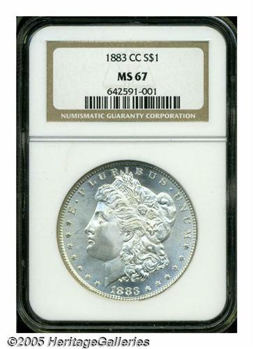 <B>1883-CC<S$1> MS67 NGC.</B></I> A brilliant, lustrous Superb Gem, with dazzling snow-white surfaces which exhibit nearly full sharpness in the centers, and a notable lack of blemishes from coin-to-coin contact. The cheek is remarkably clean, and essentially mark-free. Virtual unsurpassable quality in this popular Carson City Morgan issue. Population: 56 in 67, 0 finer (5/05).