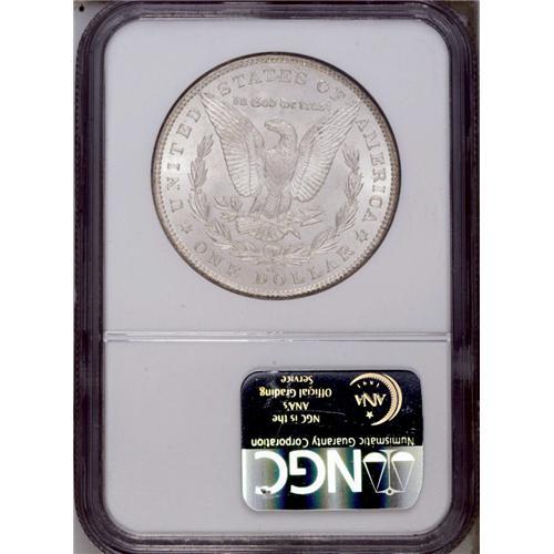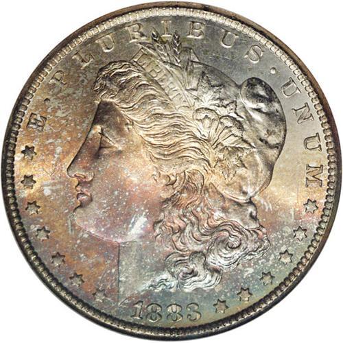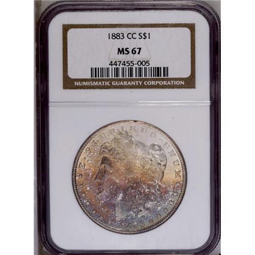 <B>1883-CC<img border='0' src='http://www.heritagecoins.com/images/star.gif' width=10 height=10>$1> MS67 NGC.</B></I> David Bowers (1993) notes that for much of the 20th century, a vast number of 1883-CC dollars were stored in the Treasury Building in Washington, D.C. Examples trickled out from this source over a number of years. Today, the '83-CC is common in Mint State, especially in MS60 to MS65 grades. Even Premium Gems are obtainable with a little searching and patience. MS67 coins become more elusive, as indicated by the population figures which point to fewer than 200 certified examples. The Superb Gem presented here displays lustrous surfaces bathed in waves of gold and reddish orange and cobalt-blue on the obverse, while the reverse is essentially untoned. The design features are well impressed, save for minor weakness in the hair curl over Liberty's ear. A small mark in the field near the chin is well concealed in the toning. Census: 77 in 67, 0 finer (2/06).