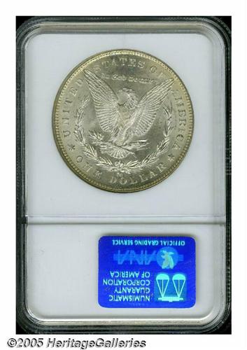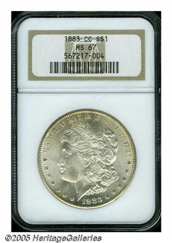 <B>1883-CC<S$1> MS67 NGC.</B></I> Like the similarly graded 1882-CC Dollar offered above, this Superb Gem has creamy white luster with frosty and unblemished surfaces. Hints of gold toning are confined to the obverse border. Population: 62 in 67, 0 finer (6/05).