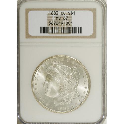 <B>1883-CC S$1 MS67 NGC.</B></I> The years 1882 through 1884 were halcyon days for the Carson City Mint, with adequate deposits of silver bullion from the nearby Comstock Lode--source of the mint's precious metal stocks--and generally healthy annual mintages of Morgan dollars exceeding 1 million pieces. Accordingly 1.2 million 1883-CC dollars were produced, a generous portion of which survives today. This coin offers frosty, untoned surfaces throughout, with a sharp strike and a near-total lack of abrasions.<BR><BR><b>Shipping:</b> Coins & Currency (<a target="_blank" href="http://www.heritageauctions.com/common/shipping.php">view shipping information</a>)