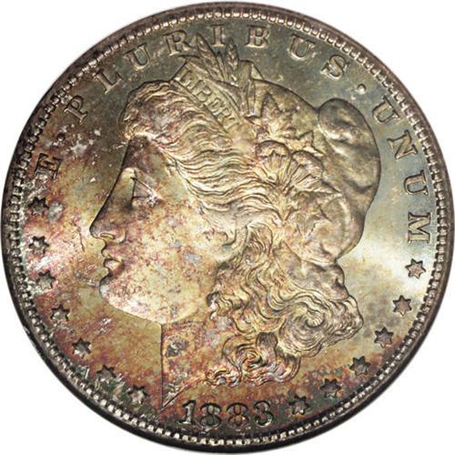 <B>1883-CC<img border='0' src='http://www.heritagecoins.com/images/star.gif' width=10 height=10>$1> MS67 NGC.</B></I> While a "common" CC dollar, this particular coin displays two characteristics that are not usually seen on Carson City dollars. First are the unusually clean surfaces. Magnification fails to show any abrasions on either side. Second, the obverse has deep toning from the canvas bag that this coin rested against for many years. Rich rose and olive coloration is intermixed on the obverse with the imprint of the cloth over Liberty's face. The reverse is brilliant. Sharply struck. Census: 74 in 67, 0 finer (1/06).