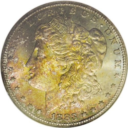 <B>1883-CC<img border='0' src='http://www.heritagecoins.com/images/star.gif' width=10 height=10>$1> MS67 NGC.</B></I> While the 1883-CC dollar is considered "common," this particular coin is unusual in two respects. First are the remarkably clean surfaces. Magnification fails to show any significant abrasions on either side. Second, the obverse has a mixture of olive-green, cobalt-blue, forest-green, and lavender coloration that was likely acquired from contact with the canvas bag in which it resided for a period of time. (In this regard, David Bowers, in his 1993 silver dollar <I>Encyclopedia,</B></I> writes: "For much of the present century, a vast reserve of 1883-CC dollars was stored in the Treasury Building in Washington, D.C.") By contrast, the reverse is brilliant. The design elements are well impressed, except for a touch of softness in the hair over Liberty's ear. Census: 79 in 67, 0 finer (6/06).