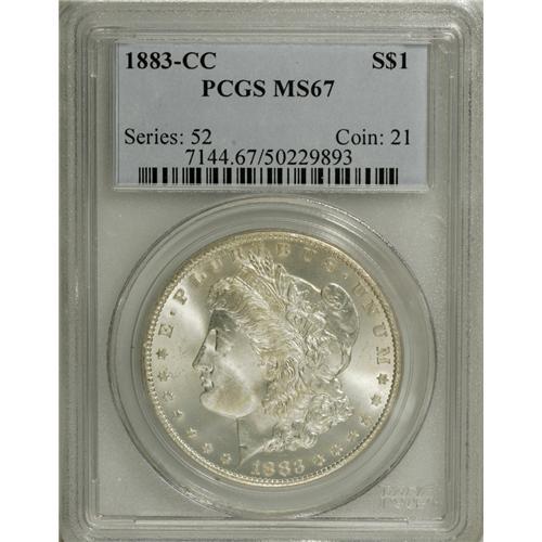 1883-CC S$1 MS67 PCGS. Brilliant, lustrous, and untone