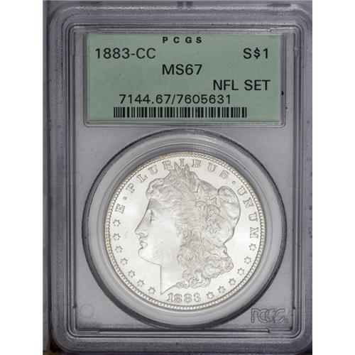 <B>1883-CC<img border='0' src='http://www.heritagecoins.com/images/star.gif' width=10 height=10>$1> MS67 PCGS.</B></I> Ex: NFL Set. A sharply struck and magnificently preserved Superb Gem. Hints of tan toning visit the centers, but this lustrous Superb Gem is generally brilliant. Outstanding quality for this popular Carson City GSA hoard issue. Certified in a prior generation, green label holder.<BR><I>Ex: Gregg Bingham NFL Collection, (Heritage, 1/01), lot 7929.</B></I><BR><I>From The Michael Casper Collection, Part Three.</B></I>