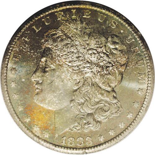 <B>1883-CC<img border='0' src='http://www.heritagecoins.com/images/star.gif' width=10 height=10>$1> MS67 Prooflike PCGS.</B></I> Waves of orange, ocean-blue, rose, and gold patina fully endow the obverse. The reverse is nearly brilliant by comparison, with only a slender, peripheral peach band. A meticulously struck and gorgeously preserved Superb Gem that will overwhelm even the jaded Carson City specialist. Encapsulated in a first generation, small-sized PCGS holder. Population: 7 in 67 Prooflike, 0 finer (1/06).<BR><I>From The Michael Casper Collection, Part Three.</B></I>