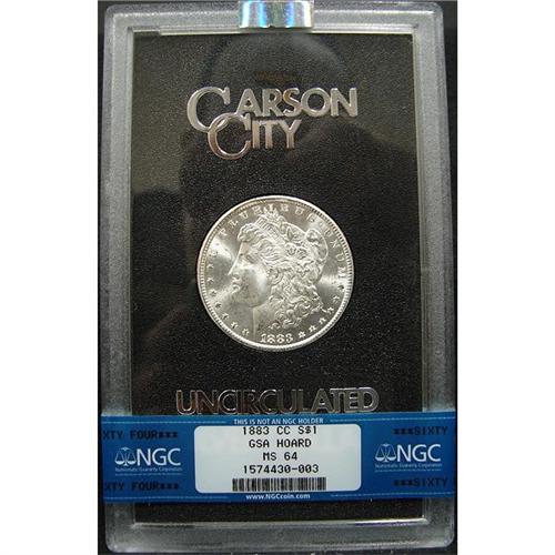 1883-CC U.S. MORGAN SILVER DOLLAR. GSA Hoard. Graded by NGC. MS 64. In case with box.
