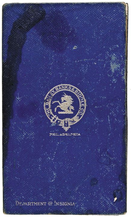 1883 Sons of the Revolution Badge. 14ct. Gold. Metal portion measuring 44mm x 30mm, Plus its Silk Ribbon, to fully about 78mm tall. About Uncirculated. Obverse design shows a Drop-wing eagle on oval medal depicting a Continental soldier, 13 stars on scalloped blue frame. Reverse design shows George Washington Bust right, with “SONS OF THE REVOLUTION - 1883” surrounding. Maker's name “Bailey, Banks & Biddle” and Member number 3882 upon the back side of the proud American Standing Eagle. The Eagle and gold jump ring attached to its original Gold-Blue-Gold, with the original Pinback fully intact, as made. Housed in its original blue and gold gilt printed “Bailey, Banks & Biddle” white silk lined (some pulls and tears to the inner box lined silk from the weight of this medal and light outer wear to the box) Presentation Box.