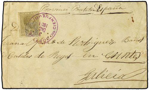 1883 Envelope from the POST AND TELEGRAPH OFFICE CIENFUEGOES bearing 10 on 10c olive bistre (SG 110) tied by oval CORRES CIENFUEGOES rubber datestamp in violet addressed to Galicia. Scarce stamp on cover surcharged "La Propaganada Literaria".