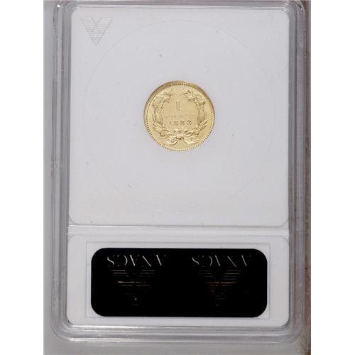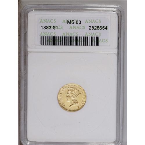 <B>1883<G$1> MS63 ANACS.</B></I> This is a remarkably affordable coin despite the limited original mintage of 10,800 business strikes. Struck from a heavily clashed obverse die, with most of LIBERTY missing (except for the L), due to apparent die polish. The somewhat mellowed luster seems to account for the grade, but there is still modest semi-prooflikeness on both sides. The color is deep and primarily greenish-gold in shade. <BR><BR><B>Important notice:</B> Heritage usually auctions material at the rate of 200-250 lots per hour. On some occasions eBay Live bid software or the Internet may not be able to keep up with the pace of the auction. We recommend placing a realistic absentee bid now as insurance to avoid disappointment. Occasionally the auctioneer may eliminate or reject an eBay Live bid, and the auctioneer may also reopen a lot after the close of the eBay live bidding (usually because we missed an audience bid), and may reject your bid even if it shows you as the winning bidder. By bidding via eBay Live, you agree that Heritage may award the lot to another bidder at its sole discretion under the circumstances described above or any other reasonable circumstances. Since eBay bids are not shown to us until we open the lot on the floor, we treat those bids just like floor bids. In most cases the floor responds before the eBay bid is presented to us, due to Internet lag time, so for consistency we have made it a policy that floor bids are always considered first over tie eBay live bids. Also please note that all Heritage lots purchased through eBay Live carry a 20% Buyer's Premium. Please make sure you read the Terms and Conditions before you bid. This lot is being auctioned in conjunction with a live floor auction by Heritage Galleries & Auctioneers. All final auction and invoice information will be supplied by Heritage Galleries & Auctioneers, and all other information should be considered preliminary. Lot:2321 <BR><BR><B>Winning Notification and Billing:</B> After the FINAL session in this auction is complete, Heritage will send e-mail and snail mail invoices. This process normally takes several days. All final auction and invoice information will be supplied by Heritage Galleries & Auctioneers, and all other information should be considered preliminary. <BR><BR>This auction will be conducted on a live auction floor and over the Internet through eBay Live. If you choose to place an absentee bid, please take a moment to <font color='#0000ff'><u><a href='http://pages.ebay.com/liveauctions/help/before/laabsentee.html'>learn how eBay Live absentee bidding works</a></u></font><font color='#000000'>