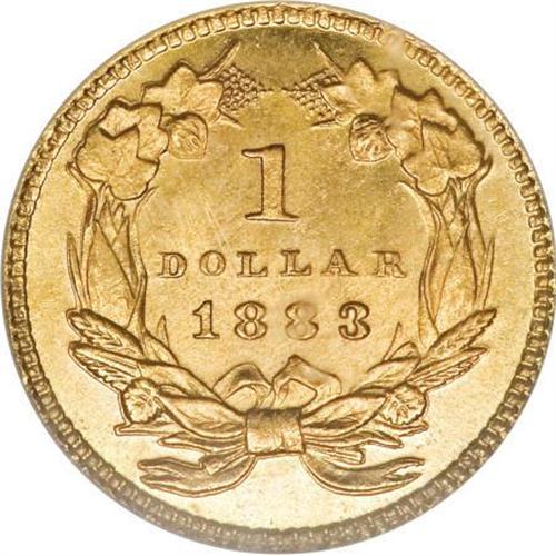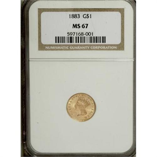 <B>1883 G$1 MS67 NGC.</B></I> Amazing eye appeal is the result of frosty yellow-gold surfaces, full design details, and brilliant mint luster. In seeming contradiction to the general physical description of the date by Jeff Garrett and Ron Guth, the surfaces lack any copper spots or stains, and the rim is well formed without the irregularities they describe. Census: 84 in 67, 6 finer (7/07).<BR><BR><B>Coin Engraver:</B> James B. Longacre<BR><BR><b>Shipping:</b> Coins & Currency (<a target="_blank" href="http://www.heritageauctions.com/common/shipping.php">view shipping information</a>\)