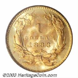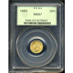 <table><tr><td><TABLE cellSpacing=0 cellPadding=0 width="100%" bgColor=#000000 border=0><TBODY> <TR><TD width="100%"><TABLE cellSpacing=1 cellPadding=3 width="100%" border=0><TBODY><TR><TD width="100%" bgColor=#79735c><FONT face=arial color=#ffffff size=3><B>Description</B> </FONT></TD></TR><TR><TD width="100%" bgColor=#ffffff><FONT face=arial size=2><B>1883 G$1 MS67 PCGS.</B></I> The desirability of the 1883 stems not from its absolute rarity, but rather from its awe-inspiring visual appeal and its relative availability for high grade type purposes. This may seem strange for a Gold Dollar with a limited original mintage of 10,800 pieces, but this issue appears to have been spared from widespread circulation. This lot offers a beautifully colored, reddish-gold representative with satiny features overall. There are no singular mentionable marks or other post-striking problems.<BR><I>From the Holman Family Collection.</B></I> </FONT></TD></TR></TBODY></TABLE></TD></TR></TBODY></TABLE><BR><A name=PricesRealized></A><TABLE cellSpacing=0 cellPadding=0 width="100%" bgColor=#000000 border=0><TBODY><TR><TD width="100%"><TABLE cellSpacing=1 cellPadding=3 width="100%" border=0><TBODY><TR><TD width="100%" bgColor=#79735c><A name=PR><FONT face=arial color=#ffffff size=3><B>Previous Prices from Heritage Auctions</B> </FONT></A></TD></TR><TR><TD bgColor=#f6f6ed><TABLE cellSpacing=0 cellPadding=0 width="100%" border=1><TBODY><TR><TD align=middle width="33%"><B>Date</B></TD><TD align=middle width="33%"><B>Service</B></TD><TD align=middle width="33%"><B>Price</B></TD></TR><TR bgColor=whitesmoke><TD width="33%"><B>10/06/2000</B></TD><TD width="33%">PCGS</TD><TD width="33%">$2,530.00</TD></TR><TR bgColor=whitesmoke><TD width="33%"><B>01/05/1994</B></TD><TD width="33%">PCGS</TD><TD width="33%">$4,620.00</TD></TR><TR bgColor=whitesmoke><TD width="33%"><B>10/12/2000</B></TD><TD width="33%">PCGS</TD><TD width="33%">$4,945.00</TD></TR><TR bgColor=whitesmoke><TD width="33%"><B>05/01/1995</B></TD><TD width="33%">PCGS</TD><TD width="33%">$3,960.00</TD></TR><TR bgColor=whitesmoke><TD width="33%"><B>09/01/1993</B></TD><TD width="33%">PCGS</TD><TD width="33%">$5,280.00</TD></TR></TBODY></TABLE></TD></TR><TR><TD bgColor=#ffffff><FONT face=arial size=1 ?>PLEASE NOTE: All prices realized reflect the final hammer price PLUS the buyer's premium in auctions that charge a buyer's premium. Each item has a notation at the top of the listing indicating whether that lot included a buyer's premium. Example: A item that sells with a final hammer price of $100 and a 20% buyer's premium will display with a price realized of $120. All information listed is intended to be as accurate as possible, but errors are possible. Please use this guide carefully and inform us of any inaccuracies. </FONT></TD></TR></TBODY></TABLE></TD></TR></TBODY></TABLE><BR><TABLE cellSpacing=0 cellPadding=0 width="100%" bgColor=#000000 border=0><TBODY><TR><TD width="100%"><TABLE cellSpacing=1 cellPadding=3 width="100%" border=0><TBODY><TR><TD width="100%" bgColor=#79735c colSpan=6><FONT face=arial color=#ffffff size=3><B>Price Guide*</B> </FONT></TD></TR><TR bgColor=#f6f6ed><TD align=middle><B>Grade</B> </TD><TD align=middle><B>Coin World<BR>(Trends)</B> </TD><TD align=middle><B>Numismedia<BR>Retail</B> </TD><TD align=middle><B>Numismedia<BR>Wholesale</B> </TD><TD align=middle><B>Coin<BR>Universe</B> </TD><TD align=middle><B>Heritage<BR>Value Index</B> </TD></TR><TR bgColor=#ffffff><TD align=middle>66</TD><TD align=right>$3,150.00</TD><TD align=right>---</TD><TD align=right>$2,100.00</TD><TD align=right>$2,500.00</TD><TD align=right>$1,883.75</TD></TR><TR style="FONT-WEIGHT: bold" bgColor=#cccfdd><TD align=middle>67</TD><TD align=right>---</TD><TD align=right>---</TD><TD align=right>$3,375.00</TD><TD align=right>$4,650.00</TD><TD align=right>$3,251.33</TD></TR><TR bgColor=#ffffff><TD align=middle>68</TD><TD align=right>---</TD><TD align=right>---</TD><TD align=right>$13,500.00</TD><TD align=right>---</TD><TD align=right>---</TD></TR><TR bgColor=#ffffff><TD colSpan=6><FONT size=1>*All information listed is intended to be as accurate as possible, but errors are possible. No item may be returned or refused based on this information which is provided as a service to our customers. You should contact each pricing source directly to determine the accuracy of this information. </FONT></TD></TR></TBODY></TABLE></TD></TR></TBODY></TABLE><BR><TABLE cellSpacing=0 cellPadding=0 width="100%" bgColor=#000000 border=0><TBODY><TR><TD width="100%"><TABLE cellSpacing=1 cellPadding=3 width="100%" border=0><TBODY><TR><TD width="100%" bgColor=#79735c><FONT face=arial color=#ffffff size=3><B>Population Guide</B> </FONT></TD></TR><TR bgColor=#ffffff><TD align=middle><!-- Begin Output of Population Grid--><TABLE cellSpacing=0 cellPadding=0 width="100%" border=0><TBODY><TR><TD vAlign=center><TABLE cellSpacing=0 width="100%" border=1 cellsadding="3"><TBODY><TR><TD vAlign=center><TABLE cellSpacing=0 cellPadding=3 width="100%" border=1><TBODY><TR><TD vAlign=center align=middle bgColor=#f0f1e8 colSpan=2 <CENTER><FONT face=Arial size=2><B>PCGS Pop </B></FONT><CENTER></CENTER></TD><TD vAlign=center align=middle bgColor=#f0f1e8 colSpan=2><CENTER><FONT face=Arial size=2><B>NGC Pop</B></CENTER></FONT></TD></TR><TR><TD vAlign=center><FONT face=Arial size=2>(67)</FONT> </TD><TD vAlign=center align=right><FONT face=Arial size=2>98</FONT> </TD><TD vAlign=center><FONT face=Arial size=2>(67)</FONT> </TD><TD vAlign=center align=right><FONT face=Arial size=2>52</FONT> </TD></TR><TR><TD vAlign=center><FONT face=Arial size=2>(>67)</FONT> </TD><TD vAlign=center align=right><FONT face=Arial size=2>5</FONT> </TD><TD vAlign=center><FONT face=Arial size=2>(>67)</FONT> </TD><TD vAlign=center align=right><FONT face=Arial size=2>4</FONT> </TD></TR></TBODY></TABLE></TD></TR></TBODY></TABLE></TD></TR></TBODY></TABLE><!-- End Output of Population Grid--></TD></TR></TBODY></TABLE></TD></TR></TBODY></TABLE><BR><TA