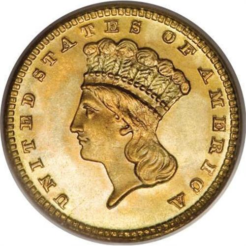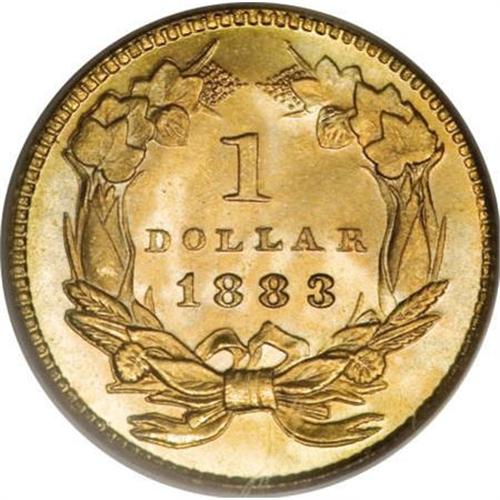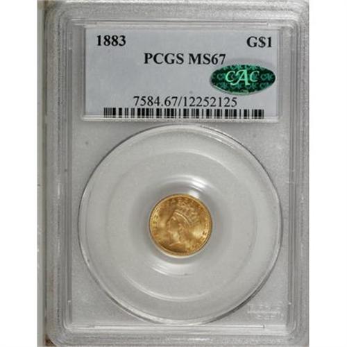 <B>1883 G$1 MS67 PCGS. CAC.</B></I> This Superb Gem has frosty orange-gold surfaces with brilliant mint luster and sharp design elements on both sides. The surfaces are pristine and essentially mark-free. Although the date is not particularly rare, only a few finer pieces have been graded over two decades of third-party coin certification.<BR><BR><B>Coin Engraver:</B> James B. Longacre<BR><BR><b>Shipping:</b> Coins & Currency (<a target="_blank" href="http://www.heritageauctions.com/common/shipping.php">view shipping information</a>)
