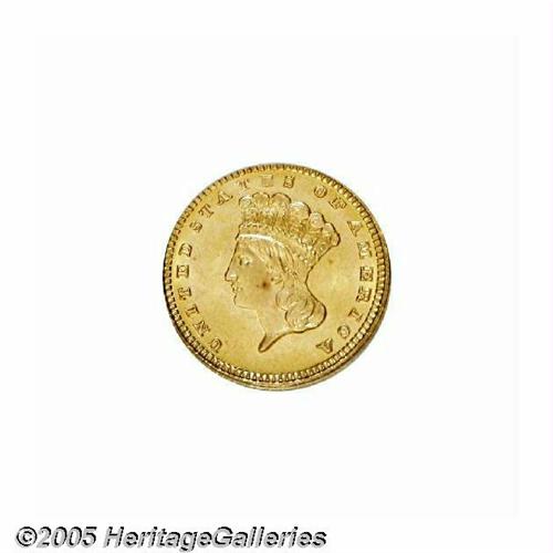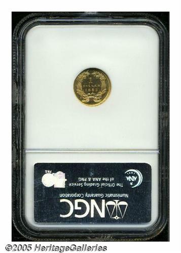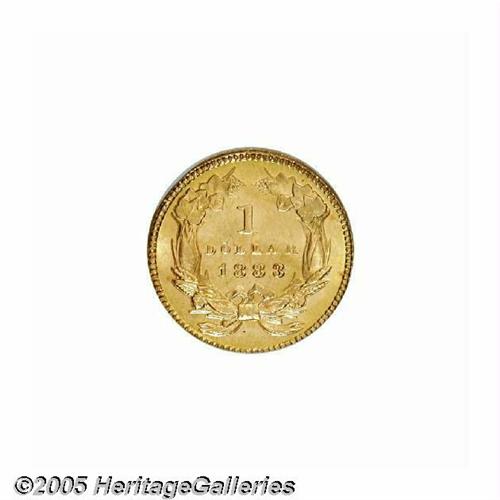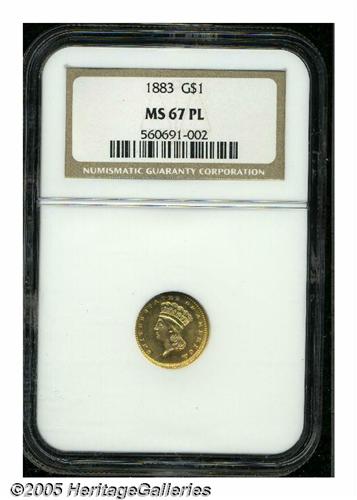 <B>1883<G$1> MS67 Prooflike PCGS.</B></I> The desirability of the 1883 stems not from its absolute rarity, but rather from its awe-inspiring visual appeal and its relative availability for high grade type purposes. This may seem strange for a Gold Dollar with a limited original mintage of 10,800 pieces, but this issue appears to have been spared from widespread circulation. This lot offers a beautifully colored, reddish-gold representative with satiny features overall. A little hazy patina overlays each side. There are no singular mentionable marks or other post-striking problems.