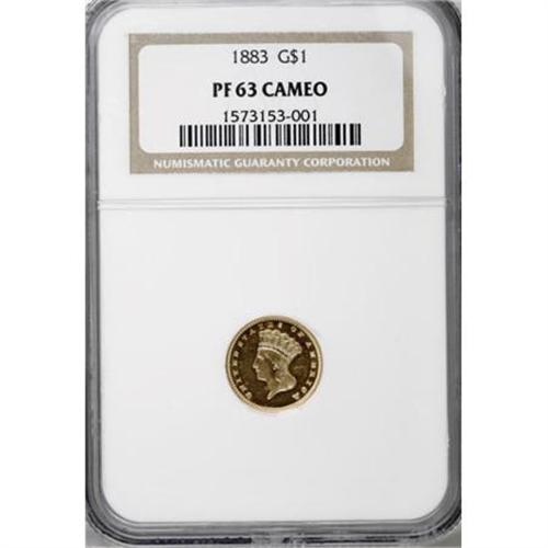<B>1883 G$1 PR63 Cameo NGC.</B></I> The prooflike nature of the business strike gold dollars produced in 1883 has confused collectors. True proofs feature a characteristic orange-peel surface and this example has that textured appearance in the deeply mirrored fields. The devices are boldly defined, lightly frosted, and display the noted Cameo contrast. Some light hairlines account for the grade, perhaps heavier on the reverse than the obverse. Census: 3 in 63 Cameo, 26 finer (12/07).<BR><BR><b>Shipping:</b> Coins & Currency (<a target="_blank" href="http://www.heritageauctions.com/common/shipping.php">view shipping information</a>)