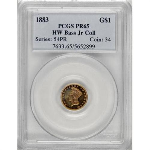 <B>1883 G$1 PR65 PCGS.</B></I> A gorgeous specimen from this popular later proof gold dollar issue, exquisitely detailed with intense mirrors and delicately contrasting devices. A primarily sun-gold and orange-gold piece that shows subtle aqua tints across parts of the reverse. An immensely appealing representative that boasts one of the most coveted pedigrees among gold enthusiasts. Population: 5 in 65, 6 finer (3/08).<BR><I>Ex: Superior, April 1973, lot 84; Harry W. Bass, Jr.; Bass III (Bowers and Merena), May 2000, lot 71.</B></I><BR><BR><B>Coin Engraver:</B> James B. Longacre<BR><BR><b>Shipping:</b> Coins & Currency (<a target="_blank" href="http://www.heritageauctions.com/common/shipping.php">view shipping information</a>)