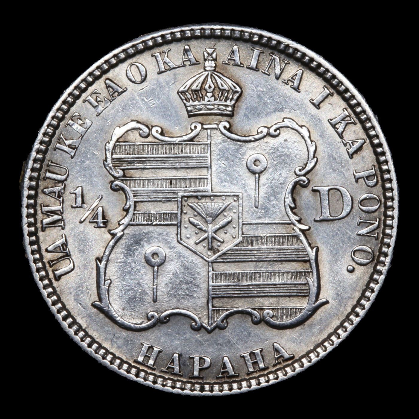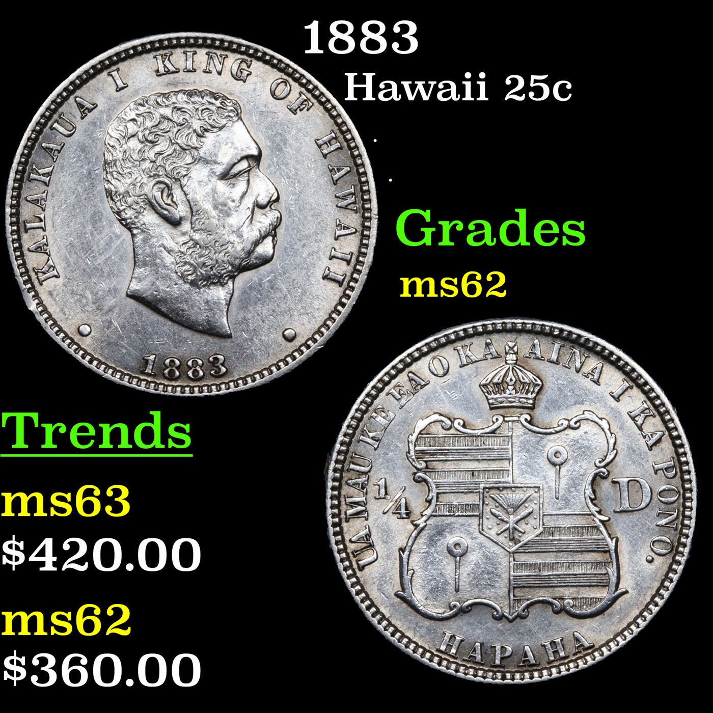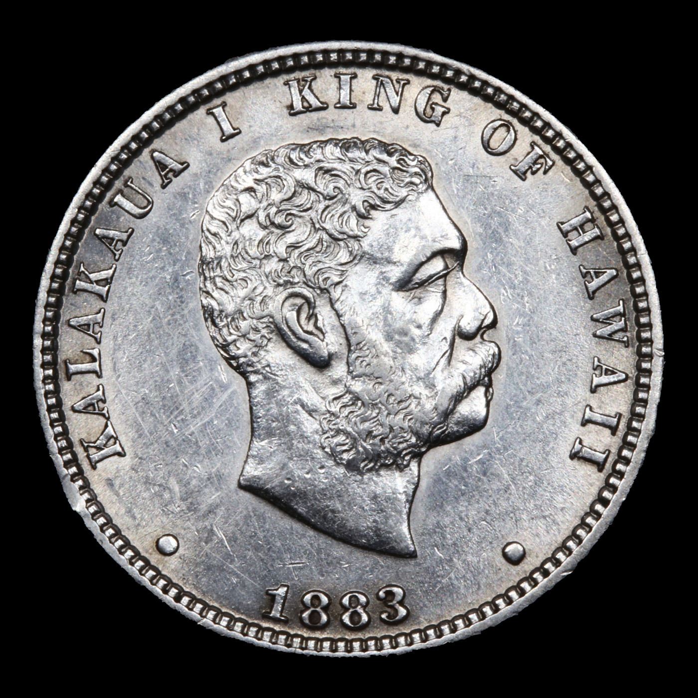 1883 Hawaii 25c Grades Select Unc. The 1883 Hawaiian "Hapaha" was struck at the San Francisco Mint on U.S. Quarter planchets. Many were redeemed and melted after Hawaii acquired U.S. territorial statusPer Maurice Gould and Kenneth Bressett writing in Hawaiian Coins, Tokens, and Paper Money (1961): "In 1883, Claus Spreckels, a banker, sugar planter, and power behind the throne, approached the King on the subject of having a silver coinage struck for the Islands. Application was made by the Hawaiian Government for the coinage at the San Francisco mint, of one million dollars in silver denominations to correspond with the silver coins of the United States of America in fineness and weight, regulations of the 9th of November, 1883, by the Secretary of the United States Treasury." Ultimately, 500,000 Hawaiian quarters were struck in 1883. The 1883 Hawaiian "Hapaha" was struck at the San Francisco Mint on U.S. Quarter planchets. Many were redeemed and melted after Hawaii acquired U.S. territorial status Per Maurice Gould and Kenneth Bressett writing in Hawaiian Coins, Tokens, and Paper Money (1961): "In 1883, Claus Spreckels, a banker, sugar planter, and power behind the throne, approached the King on the subject of having a silver coinage struck for the Islands. Application was made by the Hawaiian Government for the coinage at the San Francisco mint, of one million dollars in silver denominations to correspond with the silver coins of the United States of America in fineness and weight, regulations of the 9th of November, 1883, by the Secretary of the United States Treasury." Ultimately, 500,000 Hawaiian quarters were struck in 1883