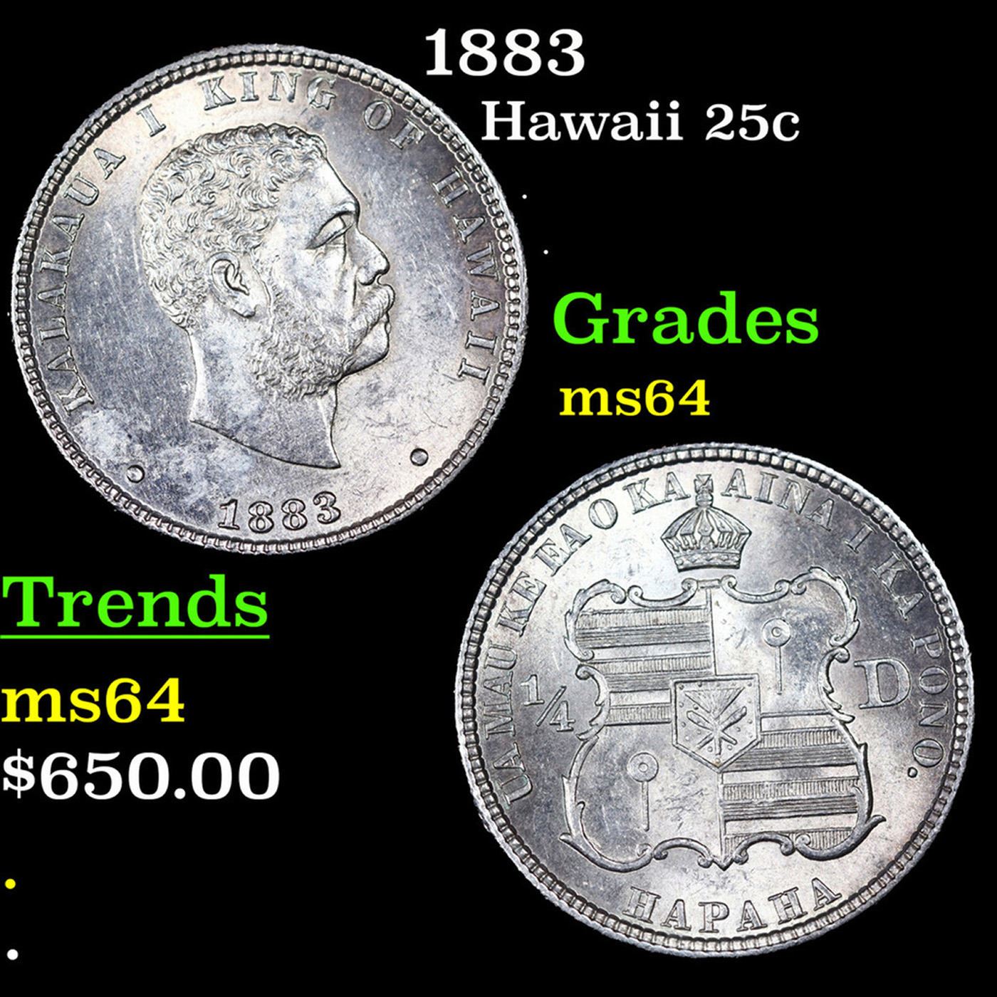 1883 Hawaii Quarter 25c Grades Choice Unc. The 1883 Hawaiian "Hapaha" was struck at the San Francisco Mint on U.S. Quarter planchets. Many were redeemed and melted after Hawaii acquired U.S. territorial statusPer Maurice Gould and Kenneth Bressett writing in Hawaiian Coins, Tokens, and Paper Money (1961): "In 1883, Claus Spreckels, a banker, sugar planter, and power behind the throne, approached the King on the subject of having a silver coinage struck for the Islands. Application was made by the Hawaiian Government for the coinage at the San Francisco mint, of one million dollars in silver denominations to correspond with the silver coins of the United States of America in fineness and weight, regulations of the 9th of November, 1883, by the Secretary of the United States Treasury." Ultimately, 500,000 Hawaiian quarters were struck in 1883. The 1883 Hawaiian "Hapaha" was struck at the San Francisco Mint on U.S. Quarter planchets. Many were redeemed and melted after Hawaii acquired U.S. territorial statusPer Maurice Gould and Kenneth Bressett writing in Hawaiian Coins, Tokens, and Paper Money (1961): "In 1883, Claus Spreckels, a banker, sugar planter, and power behind the throne, approached the King on the subject of having a silver coinage struck for the Islands. Application was made by the Hawaiian Government for the coinage at the San Francisco mint, of one million dollars in silver denominations to correspond with the silver coins of the United States of America in fineness and weight, regulations of the 9th of November, 1883, by the Secretary of the United States Treasury." Ultimately, 500,000 Hawaiian quarters were struck in 1883
