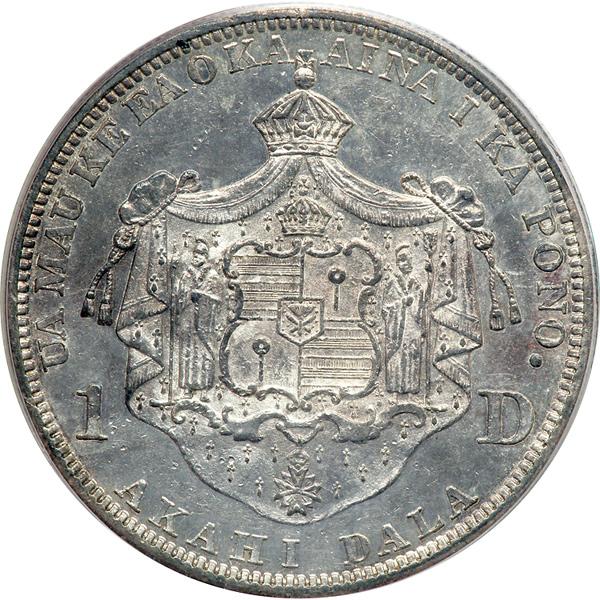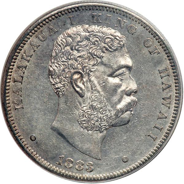 1883 Hawaiian Dollar. PCGS graded AU-50 PQ. Housed in an Old Green Holder. Toned on both sides, lustrous, with a full sharp beard on the King. These were issued in 1883 only, so a one-year Type for the Kingdom of Hawaii. Hawaii later formed a Republic before being classified a Territory of the United States. Most of the silver dollars issued by Kalakaua were later melted. Only about 10% of the issue remained (PCGS # 10995) .
