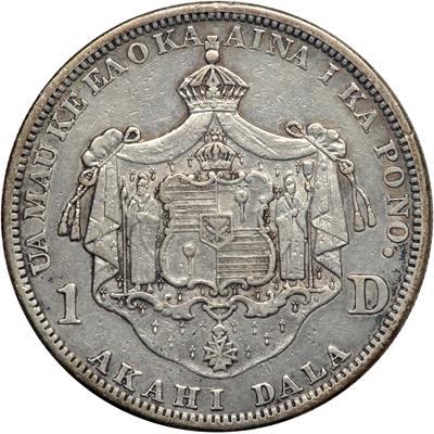 1883 Hawaiian Dollar. VF-20. Lightly cleaned. From an original 500,000 mintage, over 90% were redeemed and melted after 1904.