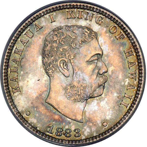 Historic note: Conception, approval, funding and creation of these handsome Hawaiian silver coins occurred in 1883-84. Though dated 1883, they first were placed into circulation in early 1884. All circulation-strike Hawaiian coinage was executed at the San Francisco Mint. The Bureau of the Mint instructed the Philadelphia Mint to send twenty pairs of dies (five sets for each of four coins) to E. F. Burton, Superintendent of the San Francisco Mint. Burton also got instructions that no coins were to be struck until a contract with the Hawaiian agent for the Kingdom, Claus Spreckles had been drawn up and approved. So the dies were made before the contract was approved, which seems curious to modern business methods. The contract, when it was approved on October 29, 1883, provided for $500,000 in dollars, $300,000 in halves, $125,000 in quarters and $75,000 in dimes, for a grand total of $1 million. Spreckles was to furnish silver bullion and to pay $17,500 for the actual minting. He had already paid $2,000 for design of the dies and $200 for twenty pairs of working dies, according to historian Jacob Adler, in his monograph "Coinage of Hawaii".