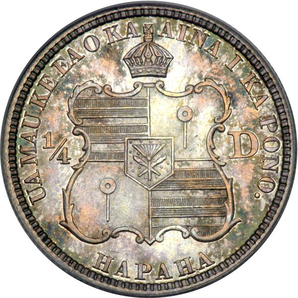 1883 Hawaiian Quarter Dollar. PCGS graded MS-66 CAC Approved. In a new secure plus holder. Pop 84; 13 finer, 1 in 66, 12 in 67. Lovely shades of toning on both sides (PCGS # 10987) .