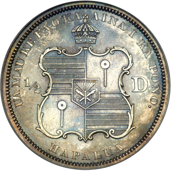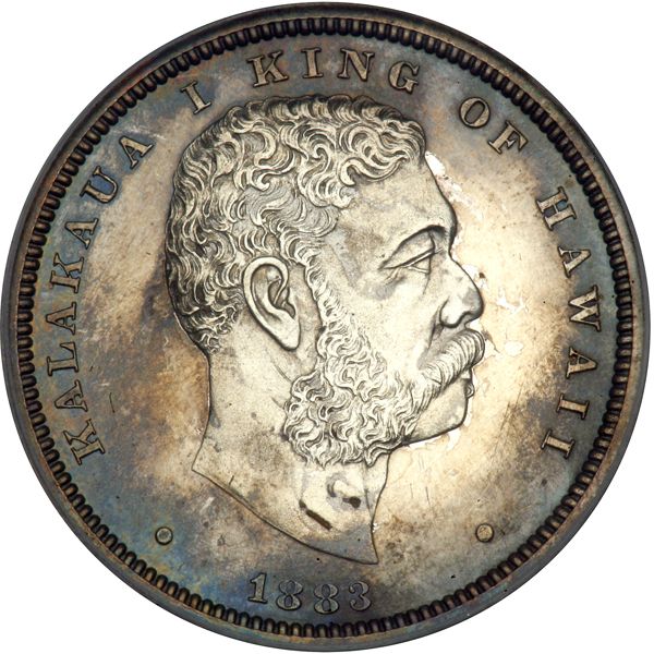 1883 Hawaiian Half Dollar. PCGS graded Proof 63. In a new secure plus holder. Pop 3; 1 finer in 66. Irregular toning on both sides. Some minor obverse marks. This rare coin?s reflective field is subtly favored by hazy toning of a typical antique-silver hue that makes this example a concerto of originality, sharp detail, and strong visual appeal. What's more, the coin's very small mintage of 26 and low surviving population are keys to its rarity, as is the finding that Proof 63 cameos are within hailing distance of the few pieces graded higher. Fully original -- an important and rare feature for this sometimes cleaned or hairlined issue. No more than the luster and toning comes a desirable strike. This piece is struck with scientific exactness throughout the devices typical of the Proof issue, from the specially prepared Proof dies installed in the Philadelphia Mint's hydraulic press used to strike U.S. Seated Liberty coins of the period and other denominations. An indispensable purchase for the advanced buyer of rare Hawaiian coins (PCGS # 10993) .