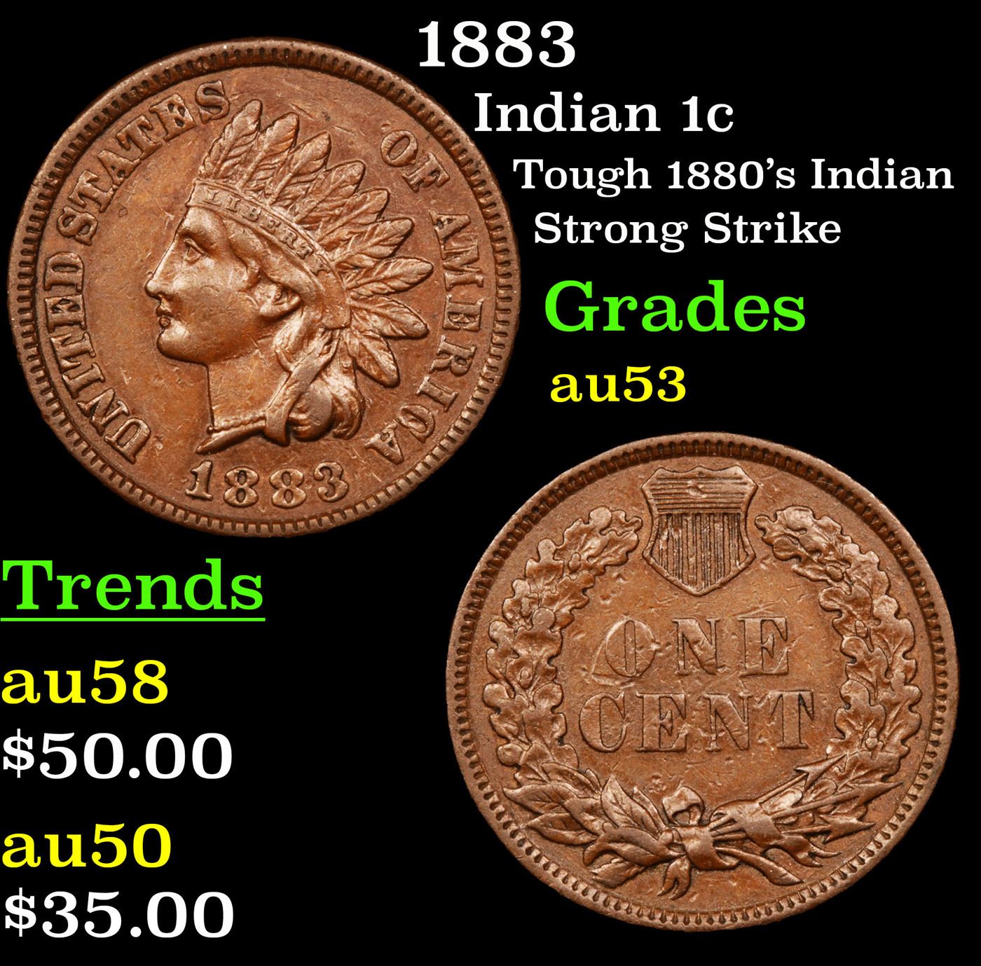 1883 Indian Cent 1c Grades Select AU.