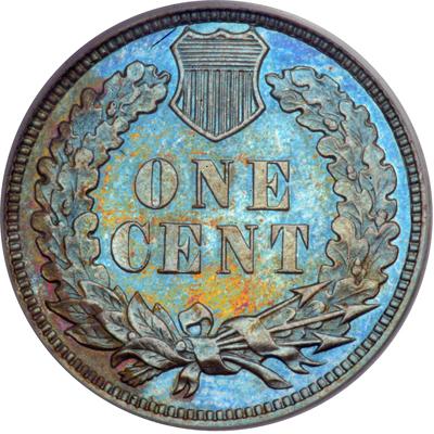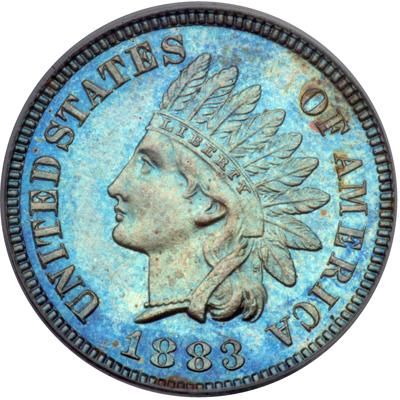 1883 Indian Head Cent. PCGS graded Proof 66 Brown. Wonderful blue toning on both sides. A first-rate Gem. Could run-a-way with the beautiful blue toning. 6,609 Proofs struck. Pop 26; 3 in PF67 BR. (PCGS # 2336).