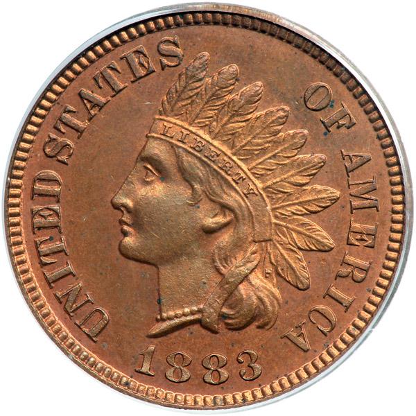1883 Indian Head Cent. PCGS graded Proof 64 Red & Brown. Attractive fiery mint red colors. Only 6,609 Proofs struck. Pop 212 (PCGS # 2337) .
