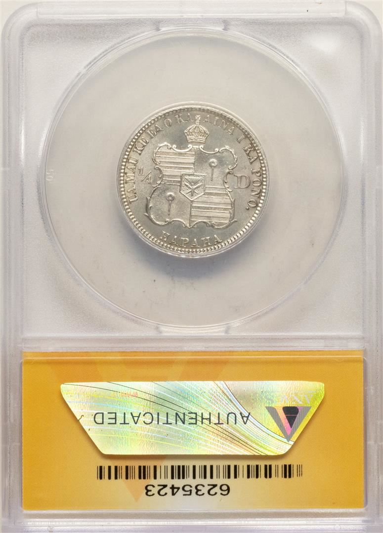 One 1883 Kingdom of Hawaii Quarter Coin ANACS MS62. ANACS Certified.