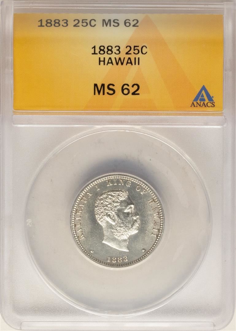 One 1883 Kingdom of Hawaii Quarter Coin ANACS MS62. ANACS Certified.