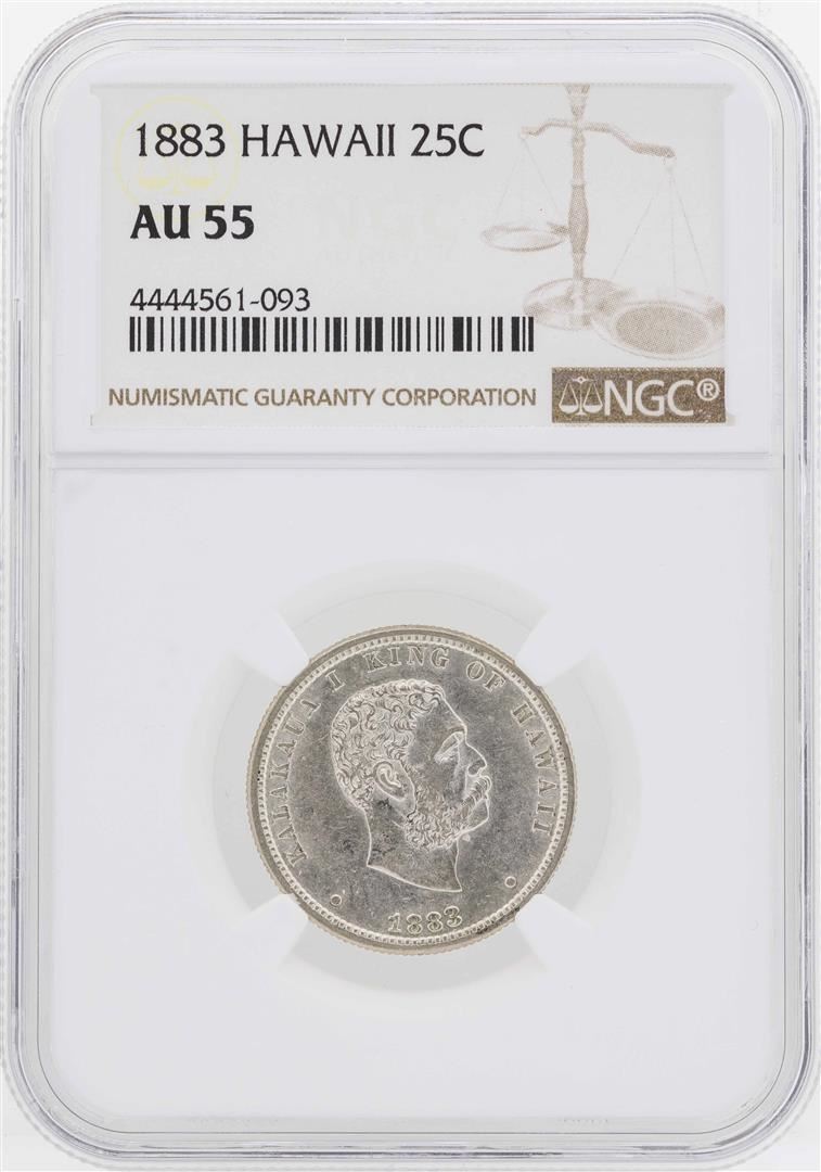 One 1883 Kingdom of Hawaii Quarter Coin NGC AU55. NGC Certified.