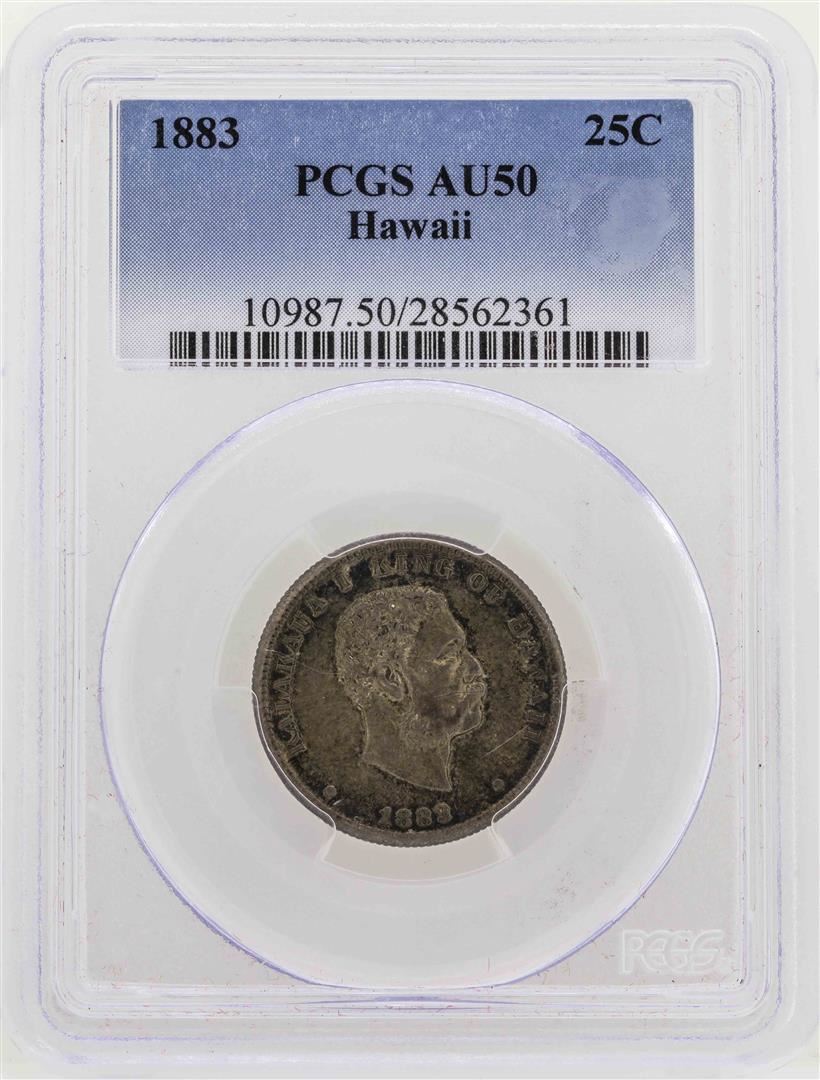 One 1883 Kingdom of Hawaii Quarter Coin PCGS AU50. PCGS Graded.
