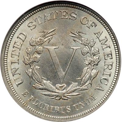 1883 Liberty Nickel. Without "CENTS". NGC graded MS-66. Nice even toning atop sleek frosty luster from top to bottom. Eye-catching beauty in a No CENTS Liberty nickel.