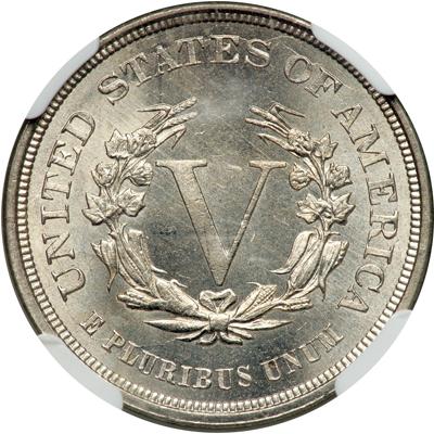 1883 Liberty Nickel. Without "CENTS". NGC graded MS-67. A nice bold strike. This conditionally elusive contribution to the sale is brilliant with rich frosty devices set against semi-prooflike fields. The strike is free of censure, being sharp in all areas. We have mentioned the luster, we have mentioned the strike. In winding up this description, we point to it being a strongly desirable one-year Type coin, and a strange one for American numismatics inasmuch as it fails to list an actual denomination. The only indicator is a large Roman numeral V on the reverse. Forgetting the fact this date was heavily hoarded at the time, Superb Gem examples like this are rarely seen nowadays, and always highly prized. Pop 48; none finer. In a new 4 pronged NGC holder.