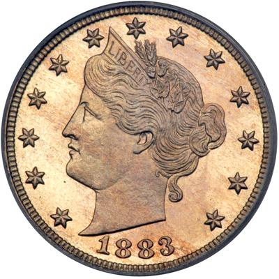 1883 Liberty Nickel. Without "CENTS". PCGS graded Proof 65. A hint of light golden toning. 5,219 Proofs struck for this one year type. A toned, lustrous, and exquisitely colorful Gem. Nothing indeterminate about it, everyone can see this coin gleaming in the distance. It's warm color is like an effervescent sunbeam shining through the evening haze that has burst suddenly into view. Pop 303; 90 in 66; 4 in 67. (PCGS # 3878).